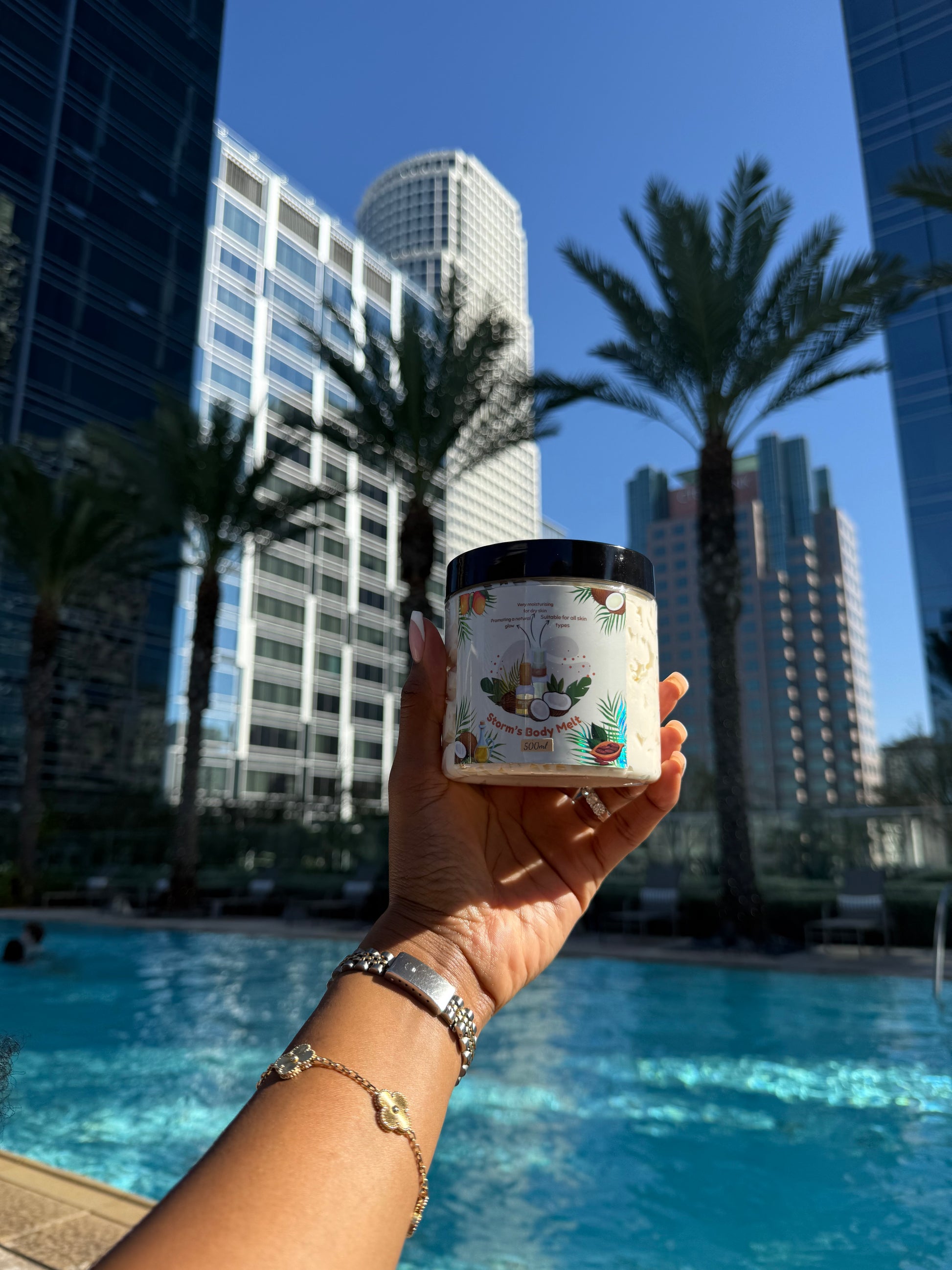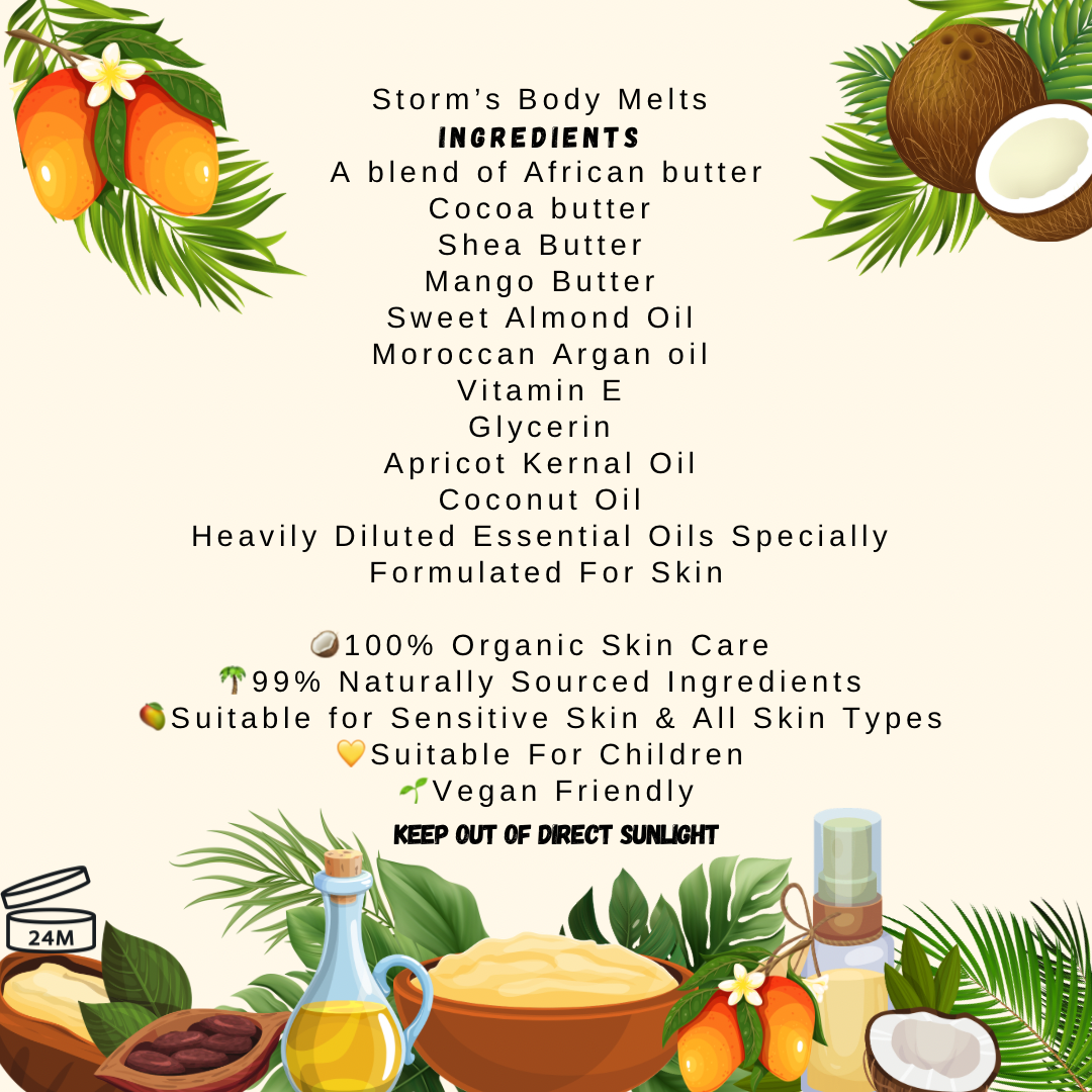 A home-made body butter made with love and the best ingredients With raw unrefined organic butters from Ivory Coast and the finest organ oil from Morocco this body melt is 100% natural and amazing for your skin packed with nutrients that will soften your skin and give you that summer Glow all year round. storms body melt smells amazing without using any harsh alcohol or perfume. we wanted to make a product that could be used for children, babies and adults with all different skin types and especially skin of colour.